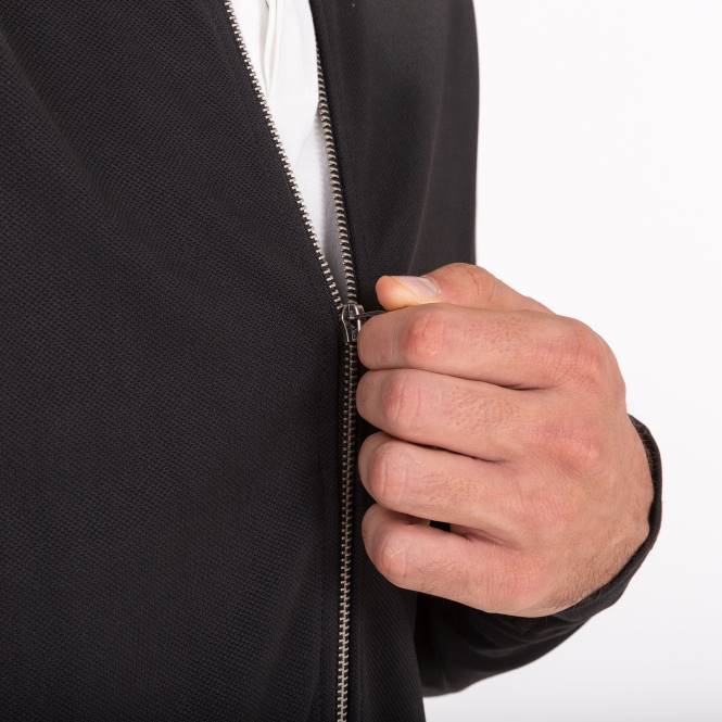fermuarlı açık ceket, yakası nervürlü. ön tarafı astarlıdır. tonda işlenmiş j logosu.