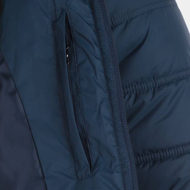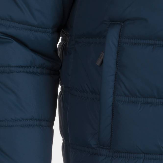 uzun yakalı, logo işlemeli bomber tarzı ceket. Bu giysi, ayarlanabilir elastik büzme ipli çıkarılabilir bir kapüşon içerir. aynı zamanda tamamı fermuarlı yan cepler ve ek iç cep içerir.