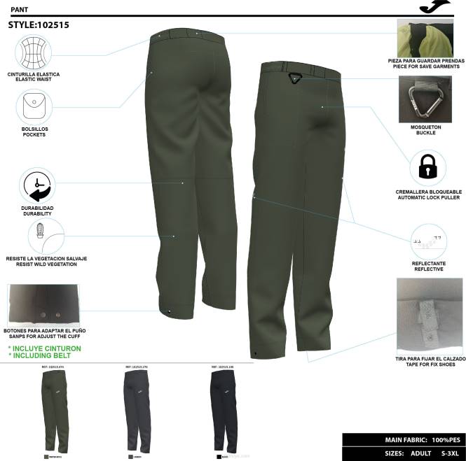 Pantolonun üst kısmı çıtçıtlı ve kilitlenebilir fermuarlıdır. giysiyi vücuda sıkı tutmak için çıtçıtlı bir kemer içerir ve ayrıca sporcunun güvenliğini veya mutfak eşyalarını taşımasını kolaylaştırmak için önde bir karabinaya sahiptir.