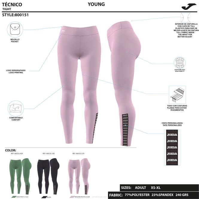 gündelik tam uzunlukta kadın taytı. sporcuya hareket özgürlüğü sunan elastik bir kumaştan yapılmalarıyla öne çıkarlar. tül bel bandı sayesinde bele otururlar ve arka kısımdaki v-şekli, oturmaya ve figürü şekillendirmeye yardımcı olur. küçük bir iç cep içerirler. Ayrıca dikiş yerleri, sürtünmeyi önleyen kamalı düz dikiş sistemi kullanılarak yapılmıştır.